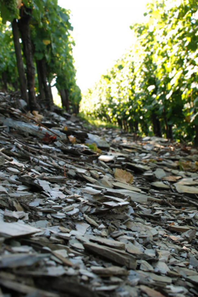 德國摩澤爾產區以出產優質的雷司令(Riesling)葡萄酒見長,其葡萄園里的土壤大多為藍色板巖和紅色板巖。這兩種土壤都較為貧瘠,擁有良好的排水性,在潮濕的生長季能防止葡萄根系因積水而腐爛。同時,它們的儲熱性也十分優秀,即使是在涼爽的年份,也能幫助葡萄藤順利成熟。此外,板巖土壤中富含酵母與細菌等微生物,產自這種土壤的雷司令葡萄酒往往帶有獨特的礦物質風味。