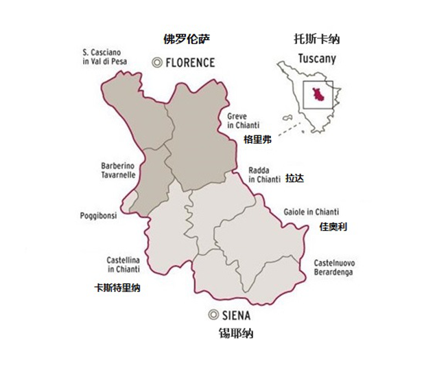 經(jīng)典基安帝產(chǎn)區(qū)地處托斯卡納(Tuscany)大區(qū)中部的佛羅倫薩市(Florence)與錫耶納市(Siena)之間,總占地7萬(wàn)余公頃,在行政區(qū)域上涉及9個(gè)市鎮(zhèn),涵蓋了拉達(dá)(Radda in Chianti)、佳奧利(Gaiole in Chianti)、卡斯特里納(Castellina in Chianti)和格里弗(Greve in Chianti)這四個(gè)市鎮(zhèn)的全部地域以及其余5個(gè)市鎮(zhèn)的部分地域。