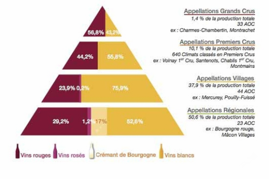 與波爾多完全不同的是,勃艮第并不是以酒莊為分級方法,而是以土地的位置為來進(jìn)行,表現(xiàn)如金字塔般垂直走向的方式,以原產(chǎn)地為命名系統(tǒng)(AOC)建立形成,井然有序的分級制度一直保存至今。