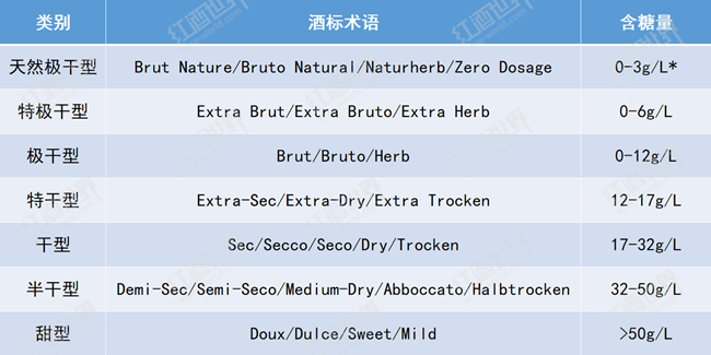 與靜止酒不同,起泡酒根據糖分含量對葡萄酒的劃分更為細致,含糖量由低到高可分為天然極干型、特極干型、極干型、特干型、干型、半干型和甜型七個類型。在使用傳統法(Traditional Method)、轉移法(Transfer Method)或罐中發酵法(Tank Method)釀造起泡酒時,酒液在最終封瓶或裝瓶前,都會使用由酒液和糖組成的調味液(Liqueur d'Expedition)進行補液,調味液中的糖分含量便決定了最終成酒的含糖量,而天然極干型起泡酒在補液時不允許添加糖分,因此最終成酒糖分含量僅在0-3g/L之間。阿斯蒂起泡酒的糖分含量則由酒精發酵終止時酒中的殘糖量決定。