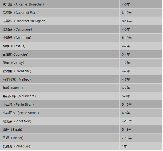 然而,即使是在超市里面,我們還是能夠輕易買到具備陳年潛力的葡萄酒,特別是紅葡萄酒(當然這些酒大多價格不菲)。具體而言,一瓶葡萄酒的陳年潛力基本上取決于其葡萄品種,不同的葡萄品種其“適飲期”也大不一樣。以下是一份各主要紅葡萄品種的適飲期指南,可供各位葡萄酒愛好者參考: