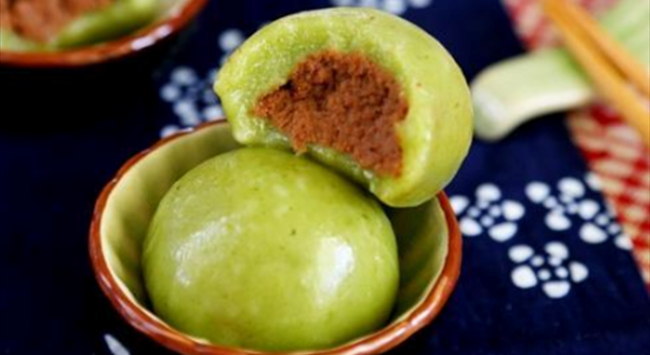 青團(tuán)油綠如玉,糯韌綿軟,團(tuán)子的餡心由細(xì)膩的糖豆沙制成,其口味香甜、軟糯。