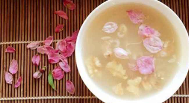 桃花粥香潤(rùn)可口,一片片桃花散發(fā)出迷人的清香,與甜美的起泡酒能形成很好的搭配。