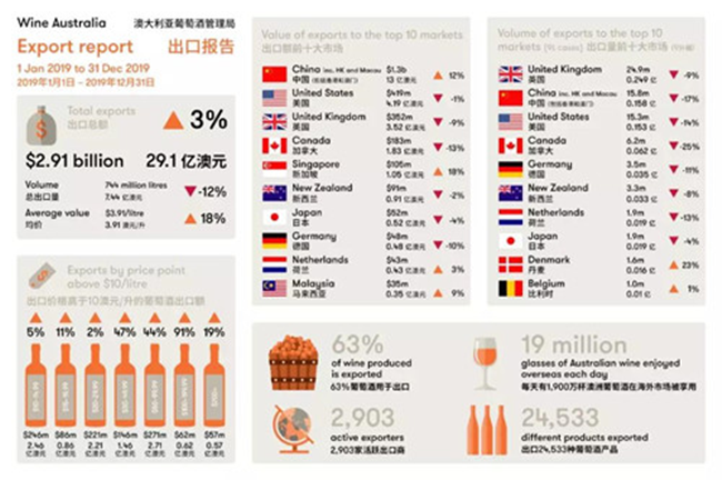 近日,澳大利亞葡萄酒管理局公布了最新出口報(bào)告。截至2019年12月底的12個(gè)月,澳大利亞葡萄酒對中國市場的出口總額及平均出口額雙雙創(chuàng)下年度新高。