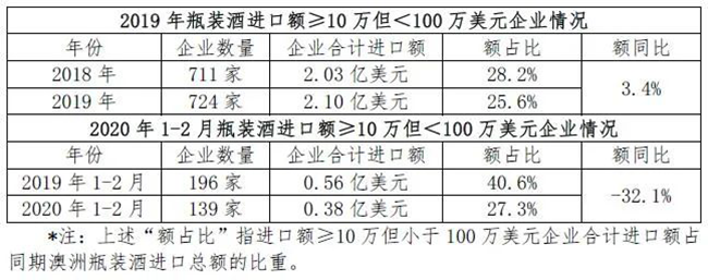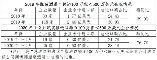 在2019年進(jìn)口葡萄酒市場(chǎng)大盤下行情況下,腰部企業(yè)(指進(jìn)口額≥100萬但<500萬美元的企業(yè))數(shù)量和合計(jì)進(jìn)口額均較快增長。尤其是今年1-2月受到疫情不利影響下,腰部企業(yè)進(jìn)口總額增幅近8成,使得其市場(chǎng)份額占比高于去年同期超16個(gè)百分點(diǎn)。