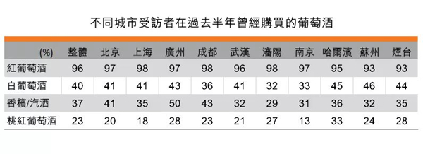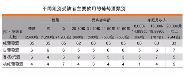 這次調查把葡萄酒分為四大類別:紅葡萄酒、白葡萄酒、桃紅葡萄酒及香檳及起泡酒。數(shù)據(jù)顯示: