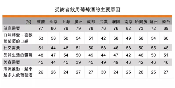 根據(jù)調查顯示結果,近年來內地消費者對飲用葡萄酒的態(tài)度觀念有所改變。以往飲用葡萄酒主要是商務應酬或社交需要,現(xiàn)在則有77%表的受訪者表示飲用葡萄酒的原因是健康需要;53%表示口味轉變,喜歡葡萄酒的口感。只有51%受訪者表示飲用葡萄酒是因為社交需要;而受潮流影響的則只有26%。
