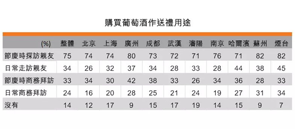 在受訪者中,有86%的人曾購買葡萄酒送禮,其中,75%的人選擇在在慶探訪親友時曾購買,34%的消費者為日常走訪親友,33%為節(jié)慶商務拜訪。