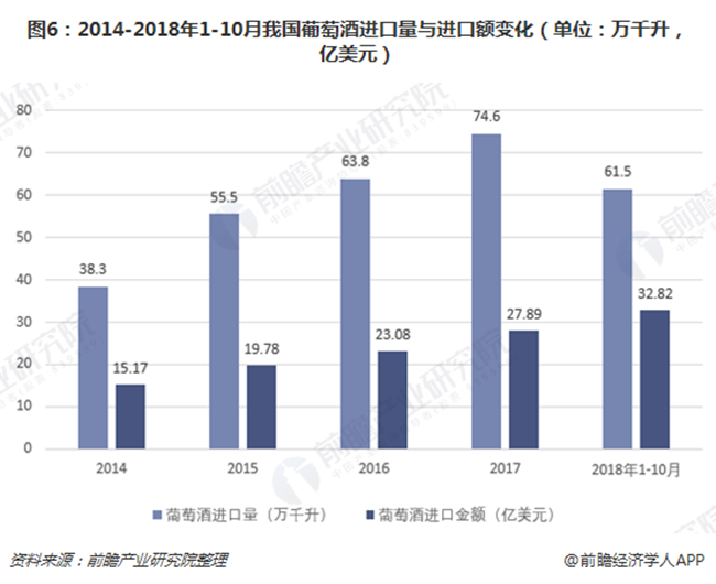 由下圖可見,隨著關稅降低,2014-2017年以來國內葡萄酒進口量和進口金額逐年穩(wěn)步增長。2018年前10月,葡萄酒進口依舊活躍,進口量達61.5萬千升,進口額實現(xiàn)32.82億美元,與國內疲軟的產量數據形成對比,反映出我國對葡萄酒的需求仍然較強,且進口葡萄酒的市場占有力已經遠超國產酒。