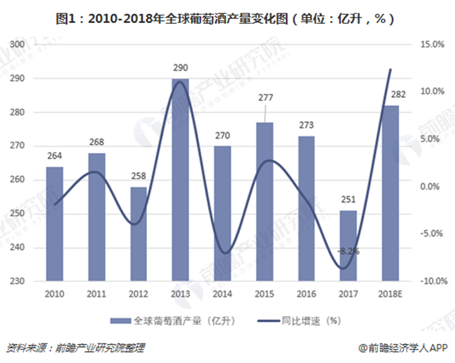 根據國際葡萄與葡萄酒組織(OIV)的數據,2017年全球葡萄酒產量為251億升,下降8.2%,是近50年來最低值,主要系當年歐盟各大葡萄酒生產國都受到了惡劣天氣的影響,歐盟各國產量降幅達14.6%。而2018年全球葡萄酒產量將大幅回升,預計實現(xiàn)282億升。