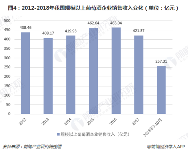 2018年前10月,我國規(guī)模以上葡萄酒企業(yè)銷售額為257.31億元,較上年同期下滑6.79%。進入2018年,進口葡萄酒大量涌入加上進口葡萄酒產品價格區(qū)間進一步下移,導致國內葡萄酒市場尤其是中低價位葡萄酒市場競爭十分激烈。