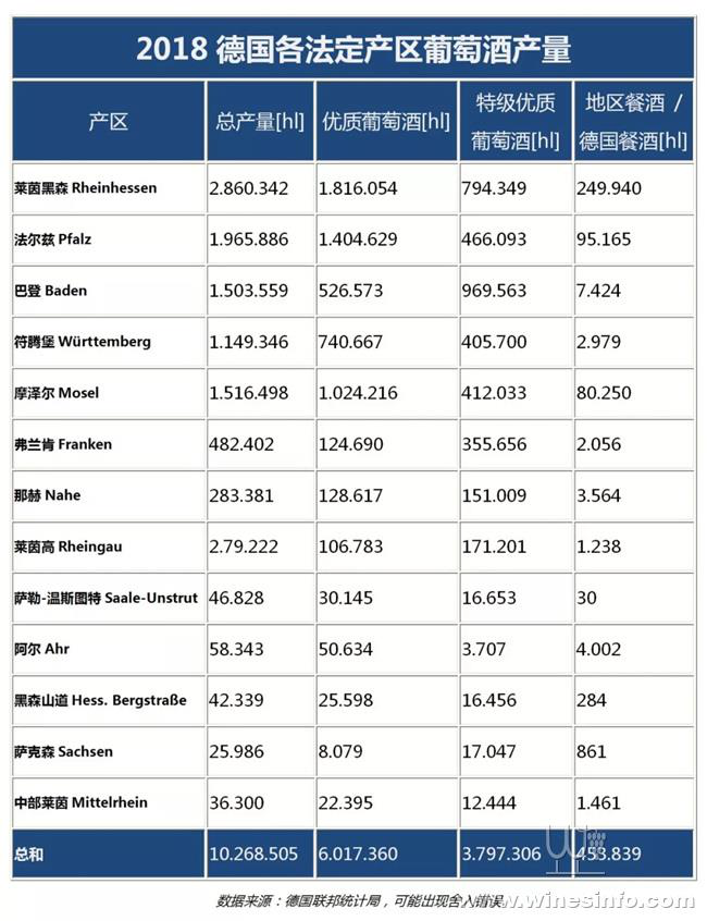 萊茵黑森的葡萄酒產量為2.86億升,是所有法定產區(qū)里最高的,法爾茲次之,為2.48億升。而巴登和符騰堡也分別收獲了1.5和1.15億升,突破了億升大關。摩澤爾收獲了近9千萬升葡萄酒,弗蘭肯為4.82千萬升,那赫為3.87千萬升,萊茵高為2.79千萬升。地區(qū)餐酒和德國餐酒的產量是4.54千萬升。