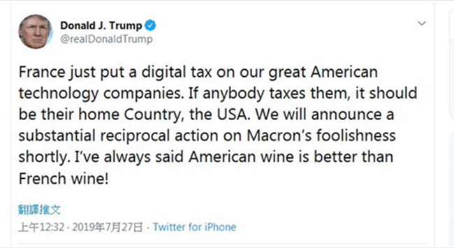 作為對法國近期宣布對全球科技巨頭征收數(shù)字服務(wù)稅的回應(yīng),據(jù)美國《紐約時報》報道,特朗普26日先是在推特上表示,“法國剛剛對我們偉大的美國科技公司征收一項數(shù)字稅,如果說有人要向他們征稅,那也應(yīng)該是他們的祖國——美國。”