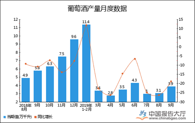 根據中國報告大廳對2019年1-9月全國葡萄酒產量進行監測統計顯示:2019年9月全國葡萄酒產量3.9萬千升,同比下降18.8%,2019年1-9月全國葡萄酒產量為30.3萬千升,累計下降10.4%。