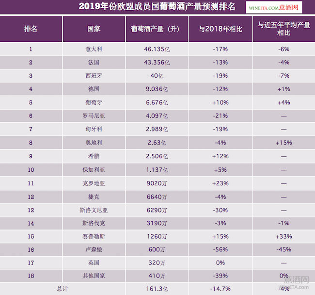 目前,歐洲各葡萄酒生產國的2019年份采摘季均已接近尾聲。歐盟委員會農業及農村發展總局(Agriculture and Rural Development - European Commission)公布了《2019年份歐盟28國葡萄酒產量預測報告》。綜合截至9月27日的最新數據,2019年份歐盟國家葡萄酒(含葡萄汁)總產量約為161.3億升,較2018年的葡萄酒總產量減少14.7%,較近五年的平均總產量減少約4%。在經歷了2018葡萄豐產之年后,2019年份歐盟各成員國的葡萄酒產量均呈下降趨勢。