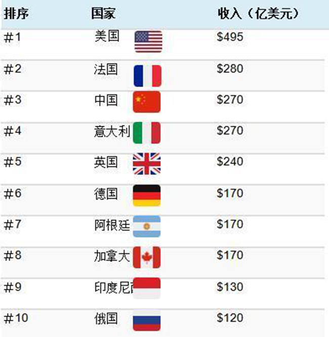 各個(gè)國家的葡萄酒銷售收入情況,單位是:10億美元。美國第一、中國第三。