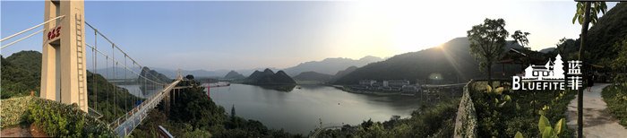 緊接著藍菲團隊乘坐山體垂直觀光電梯,平布青云,扶遙直上,到達觀光電梯空中平臺,一起俯瞰1680畝天鵝湖畔。我們相繼踏上擁有廣東省內最長、世界最長喀斯特地貌湖景玻璃橋美稱的天宮玻璃橋,輕松就能將整個湖光山色盡收眼眸,翠綠蔥郁的北江峰林重巒疊嶂,天鵝湖依山傍水波光瀲滟,一覽無遺的自然美景凝聚著和諧氛圍,眼前開豁的視野放松了我們的心情。